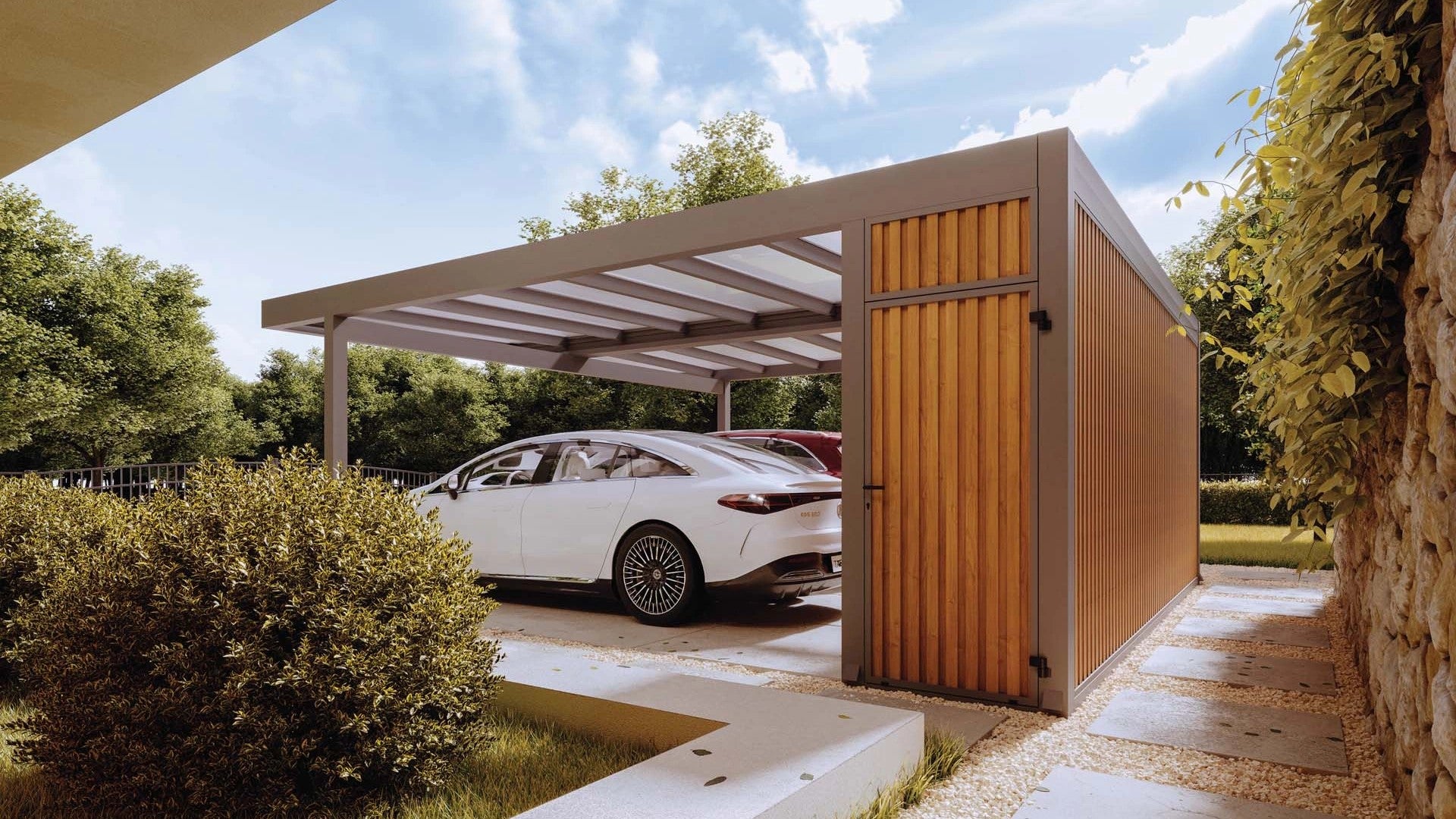 Att utrusta Carport med ett integrerat förråd ökar dessutom dess funktionalitet. Förvaring av verktyg, trädgårdsutrustning, cyklar eller biltillbehör. Förrådet är utrustat med en låsbar dörr så att sakerna inuti är säkra.