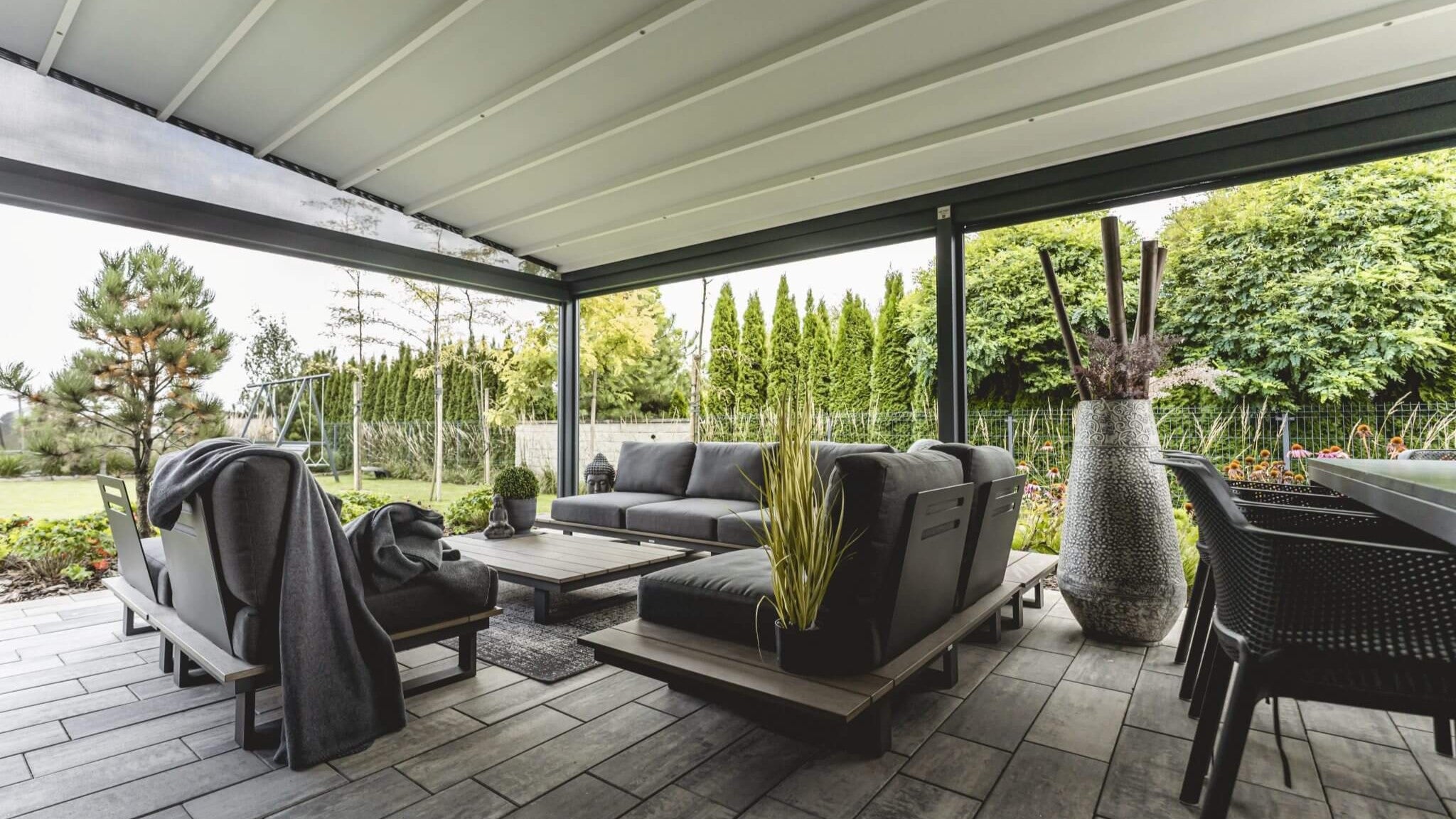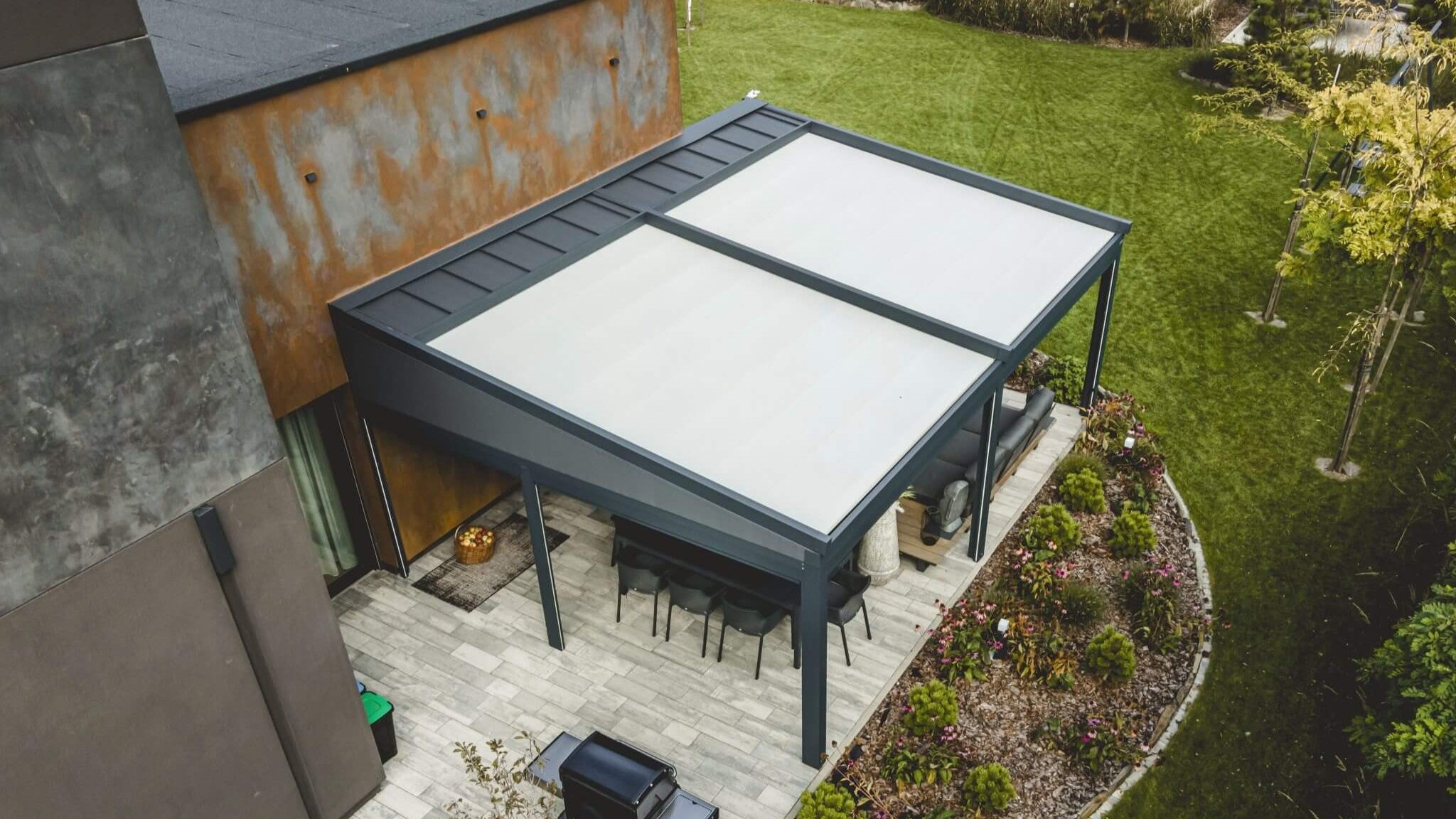 ✅ Skydd från alla sidor – Anpassningsbar med fasta väggpaneler, glaspartier, skjutbara väggar och vertikalmarkiser.