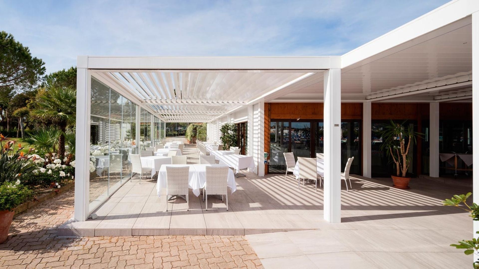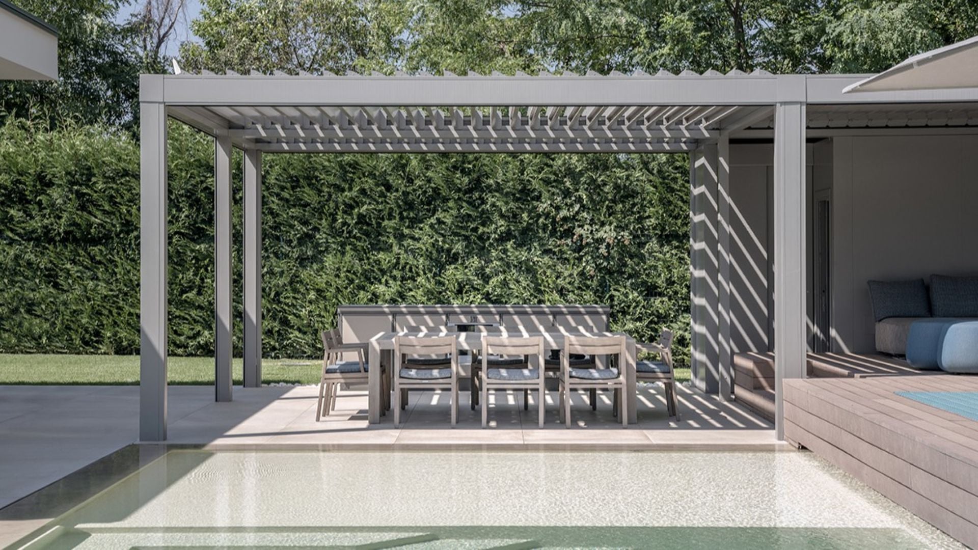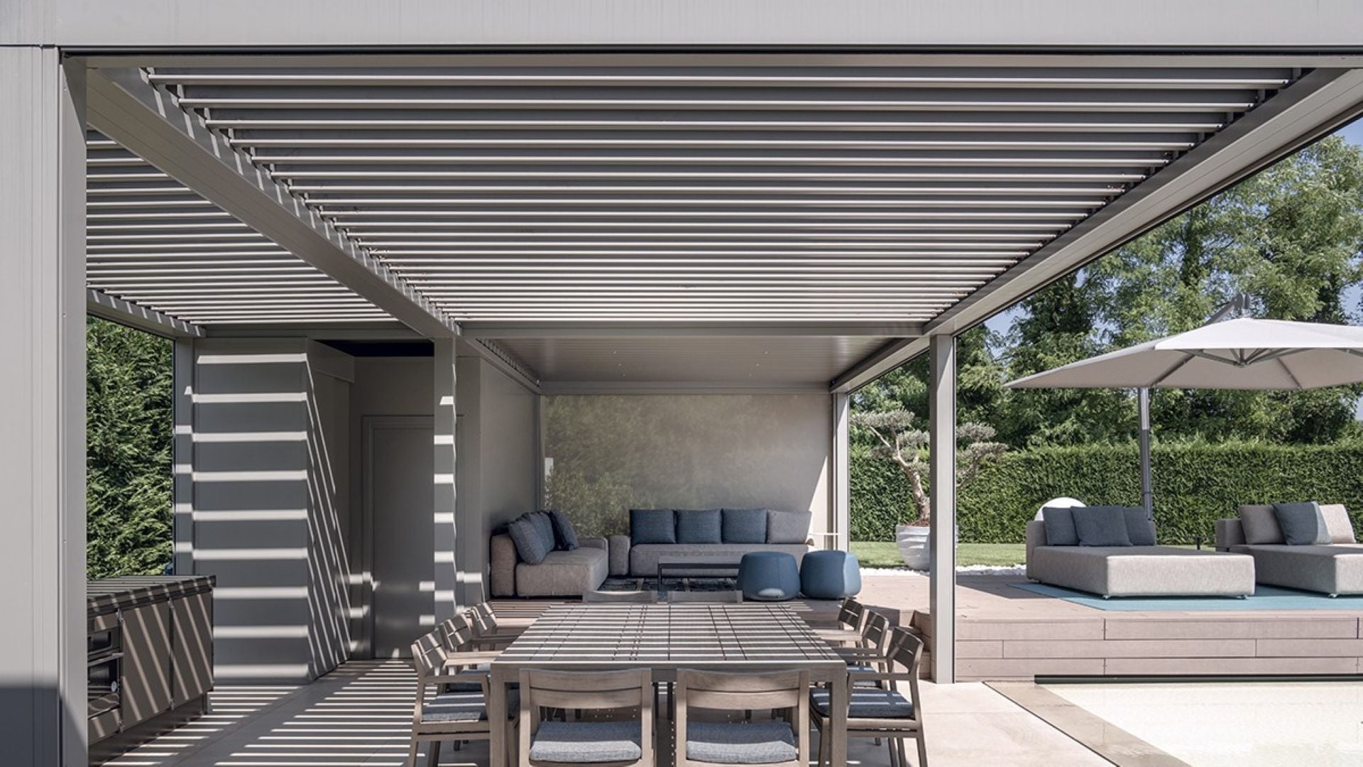 ✅ Fullständigt skydd vid dåligt väder – När lamellerna är stängda blir taket helt vattentätt och leder bort regn genom dolda rännor i pelarna.