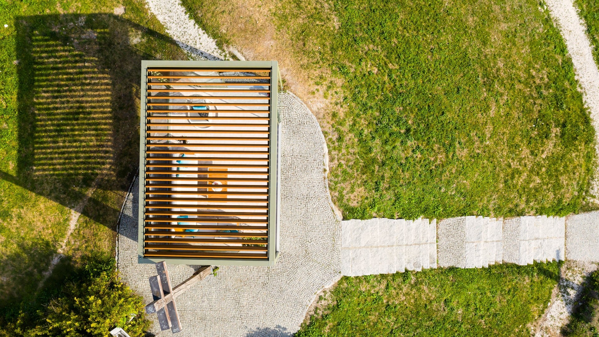 ✅ Justerbara lameller – Taket består av roterande lameller som kan justeras mellan 0° och 135° för att reglera ljus och ventilation.