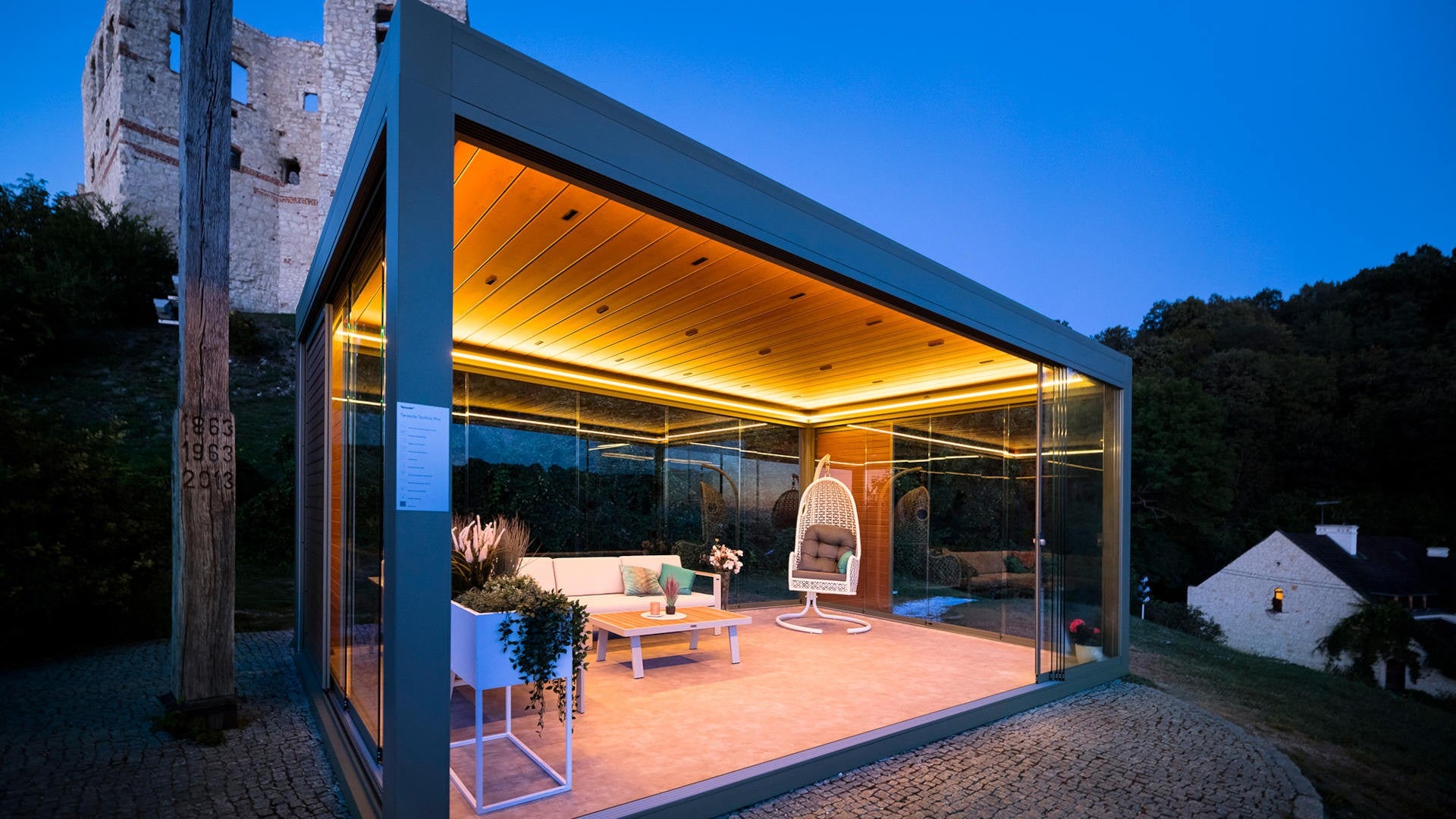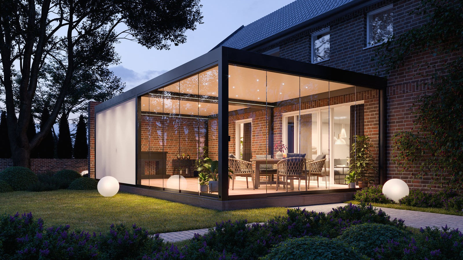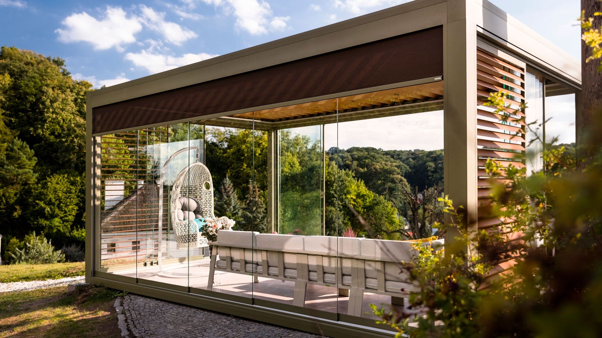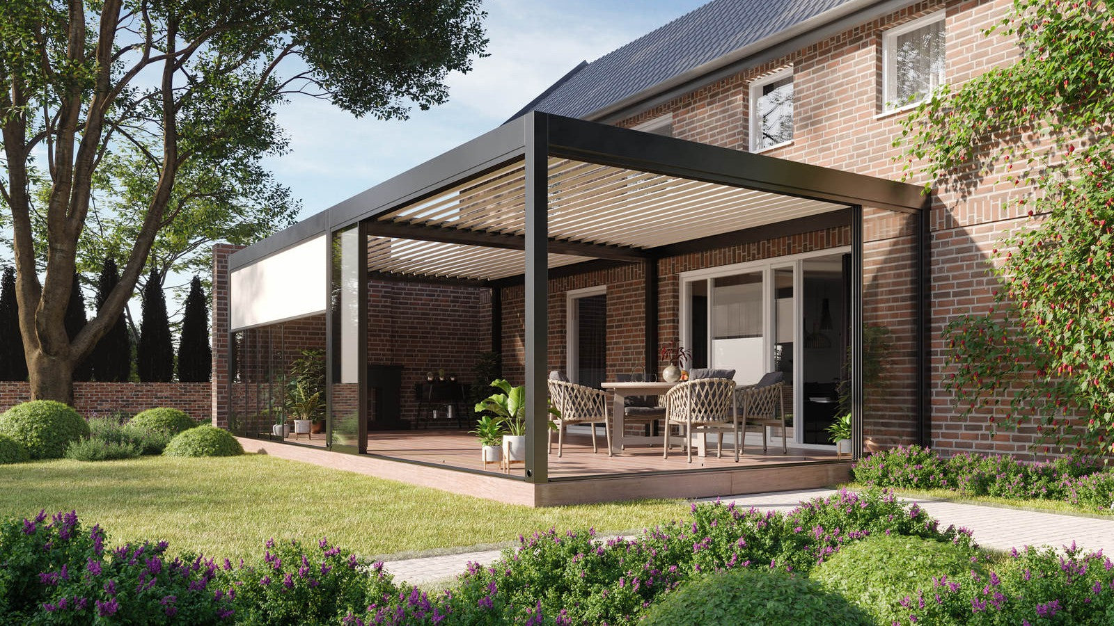 ✅ Skydd från alla sidor – Anpassningsbar med glaspartier, skjutbara väggar och vertikalmarkiser.